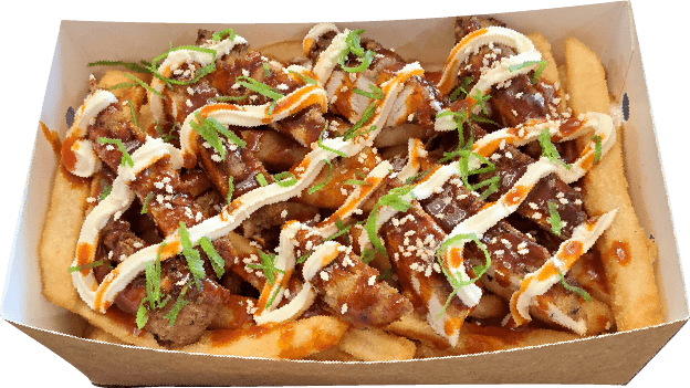 Panko-crumbed chicken (spicy version available) on crispy fries, drizzled with homemade tonkatsu sauce and creamy Kewpie mayo, finished with furikake seasoning.
