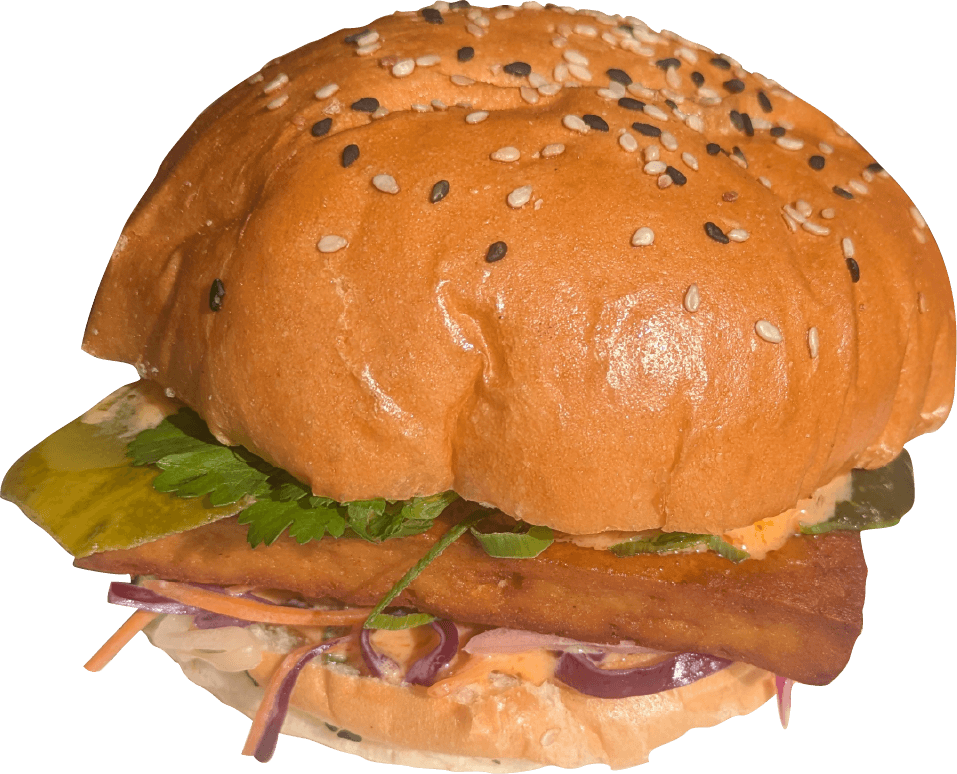 Inspired by Chinese-style home cooking, our soy-marinated tofu patty is paired with a Japanese cabbage slaw, finished with a drizzle of sriracha mayo for gentle heat, and topped with pickled cucumber, fresh coriander and chopped green shallots.